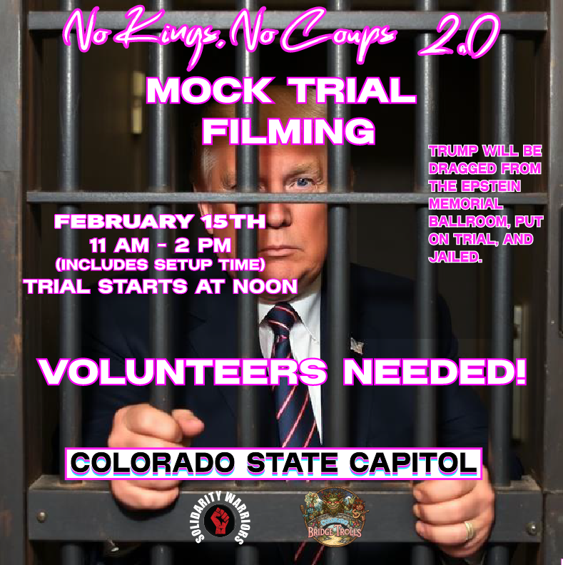 We will hold a mock trial for trump. The event will begin with the 12 jurors, dressed in silly costumes, running up to a stage prop of gilded doors with a sign reading, “EPSTEIN MEMORIAL BALLROOM.” They will drag trump out to a mock courtroom where he will be on trial for a handful of the crimes he’s committed while in office (if we listed them all, this would be a 3-day event!) As the judge reads out each charge, the 12 jurors will yell “GUILTY!”